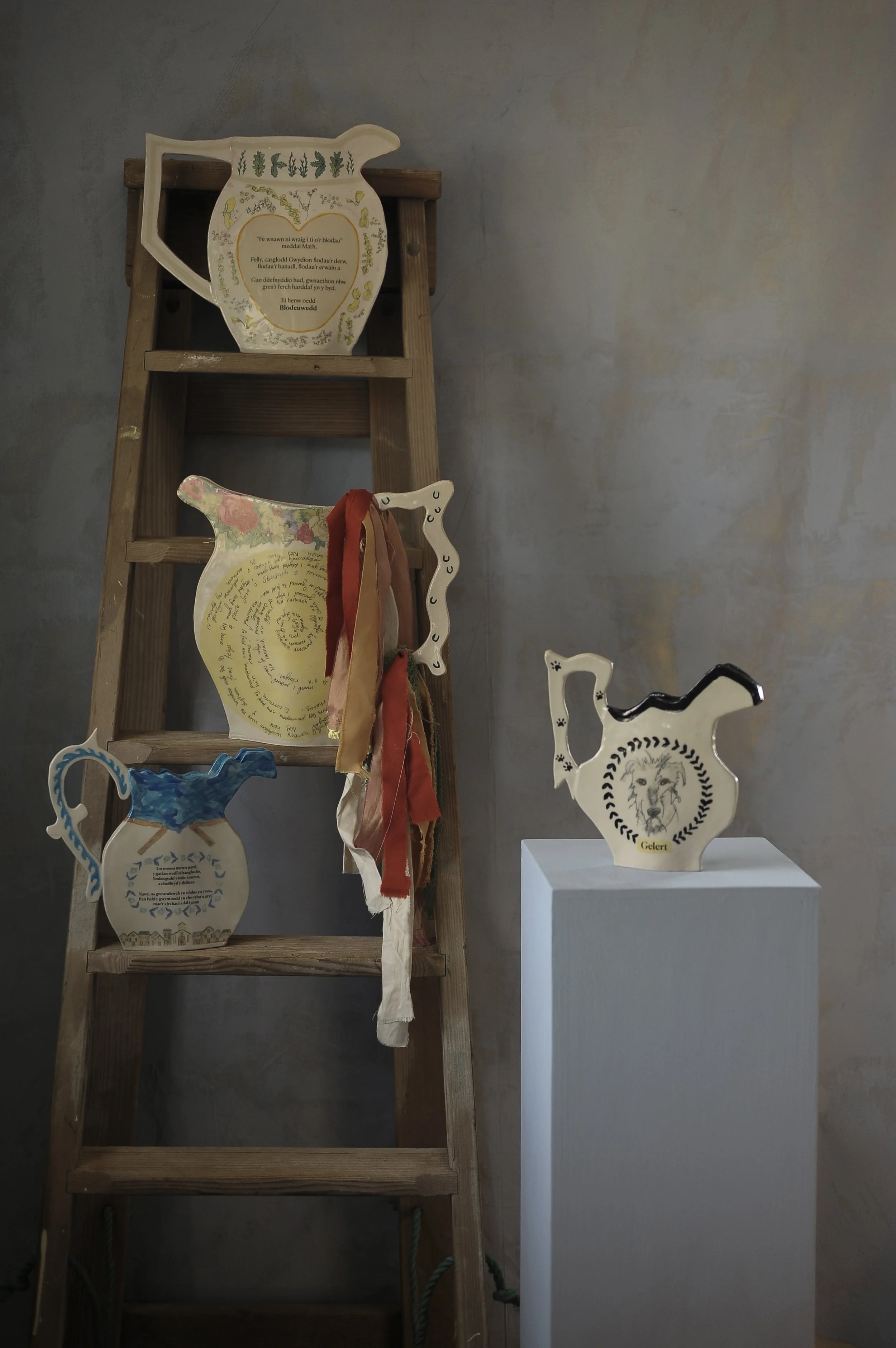 For the Craft Trail, Bonnie has created four story jugs, each one carrying the weight of a Welsh tale. The fragile beauty of Blodeuwedd, conjured from flowers yet shadowed by betrayal; the loyalty and tragedy of Gelert, the faithful hound of legend; the drowned kingdom of Cantre’r Gwaelod, where bells are said still to toll beneath the sea; and the haunting winter ritual of the Mari Lwyd. Together, these pieces celebrate the enduring power of story, giving form to myth and memory through clay.