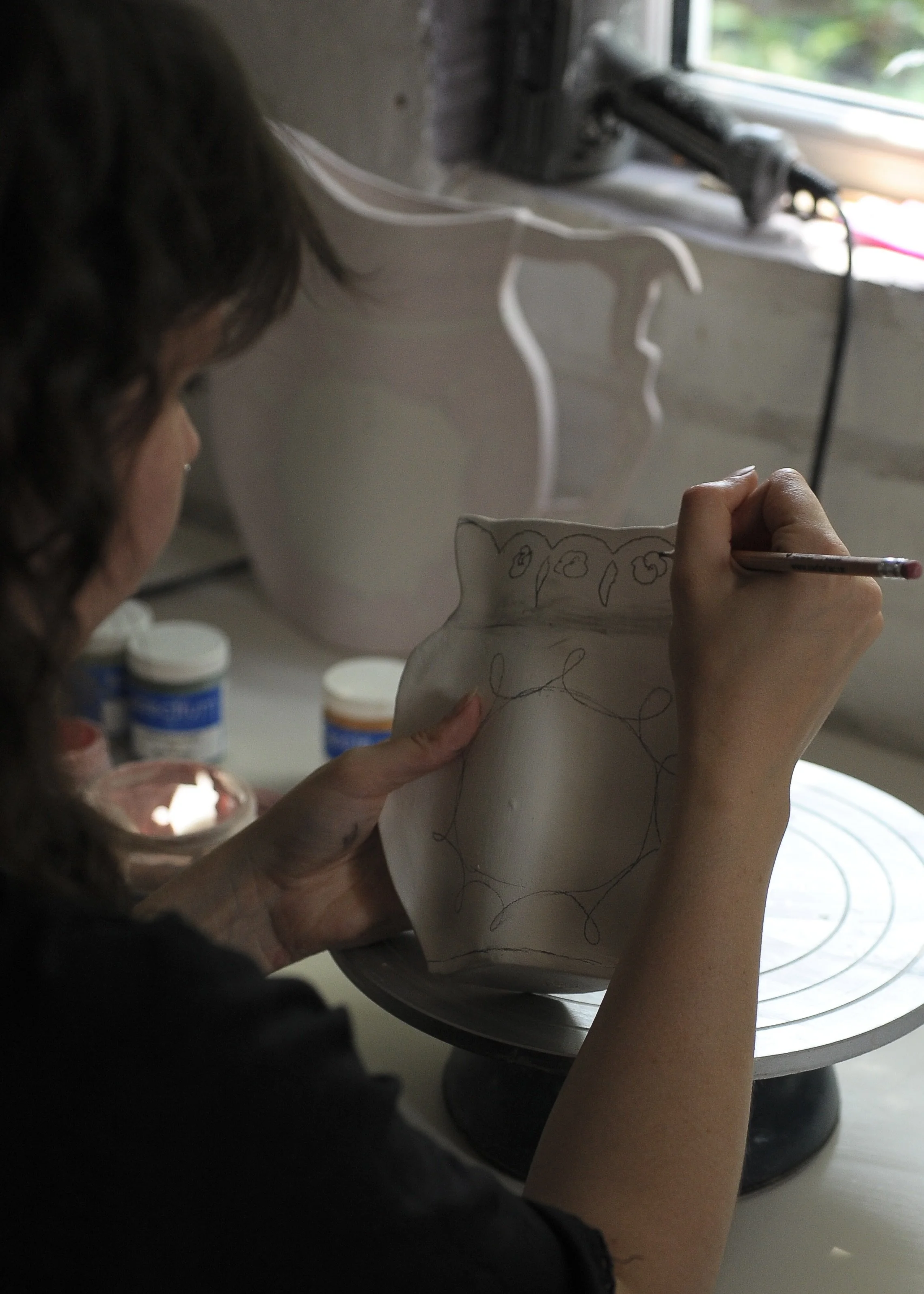 Bonnie Grace works across drawing, ceramics and printmaking, exploring objects that carry histories and patterns within them. Her practice is shaped by a lifelong fascination with antiques and commemorative ceramics, reimagined through her own hand. Beginning with continuous line drawings, she transforms these studies into clay forms, folding and pinching slabs as though they were paper. The resulting vessels shimmer with layered underglaze, ceramic pencil and lustre, drawing on traditional Welsh ceramics while speaking in a voice all her own.