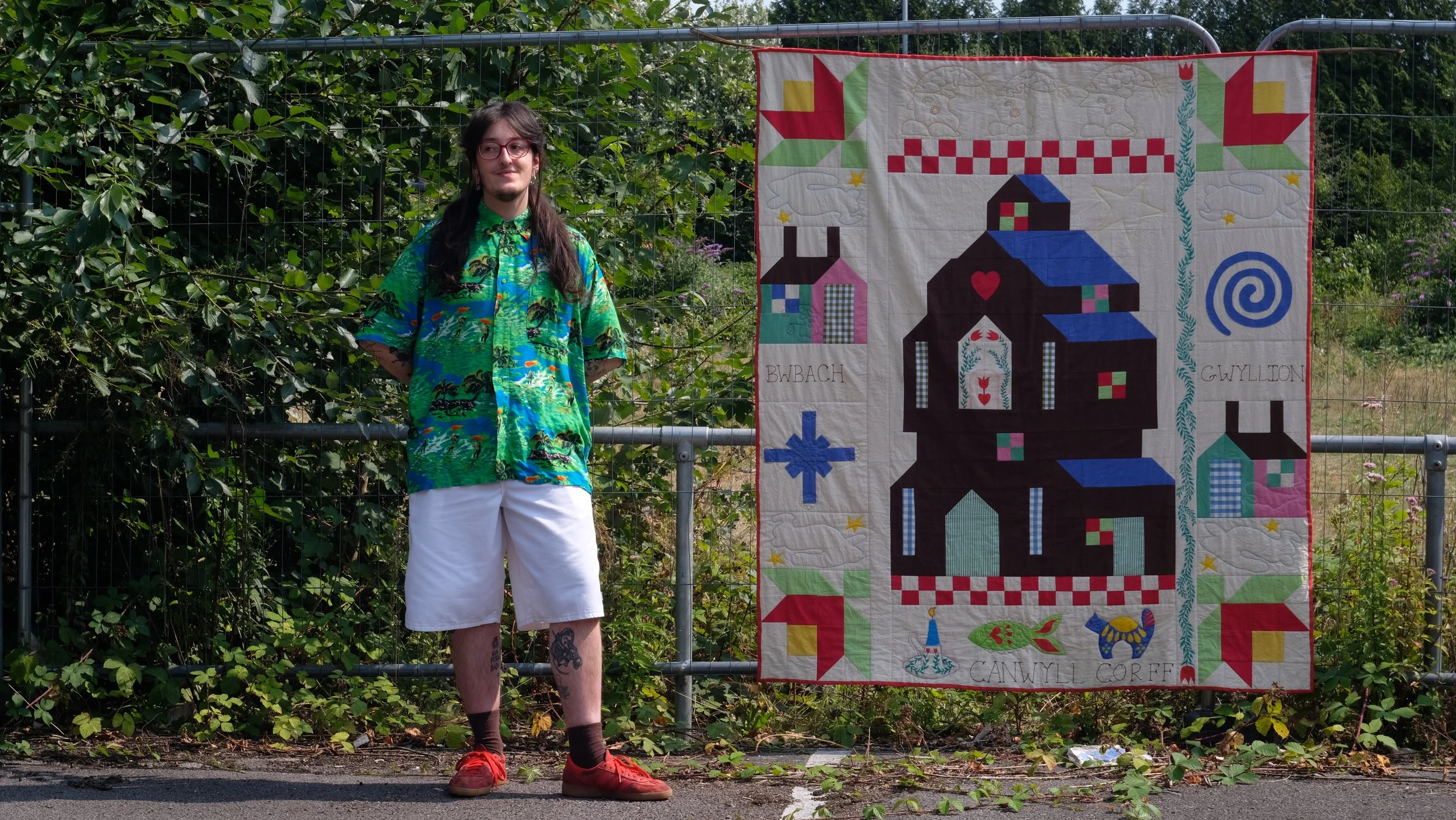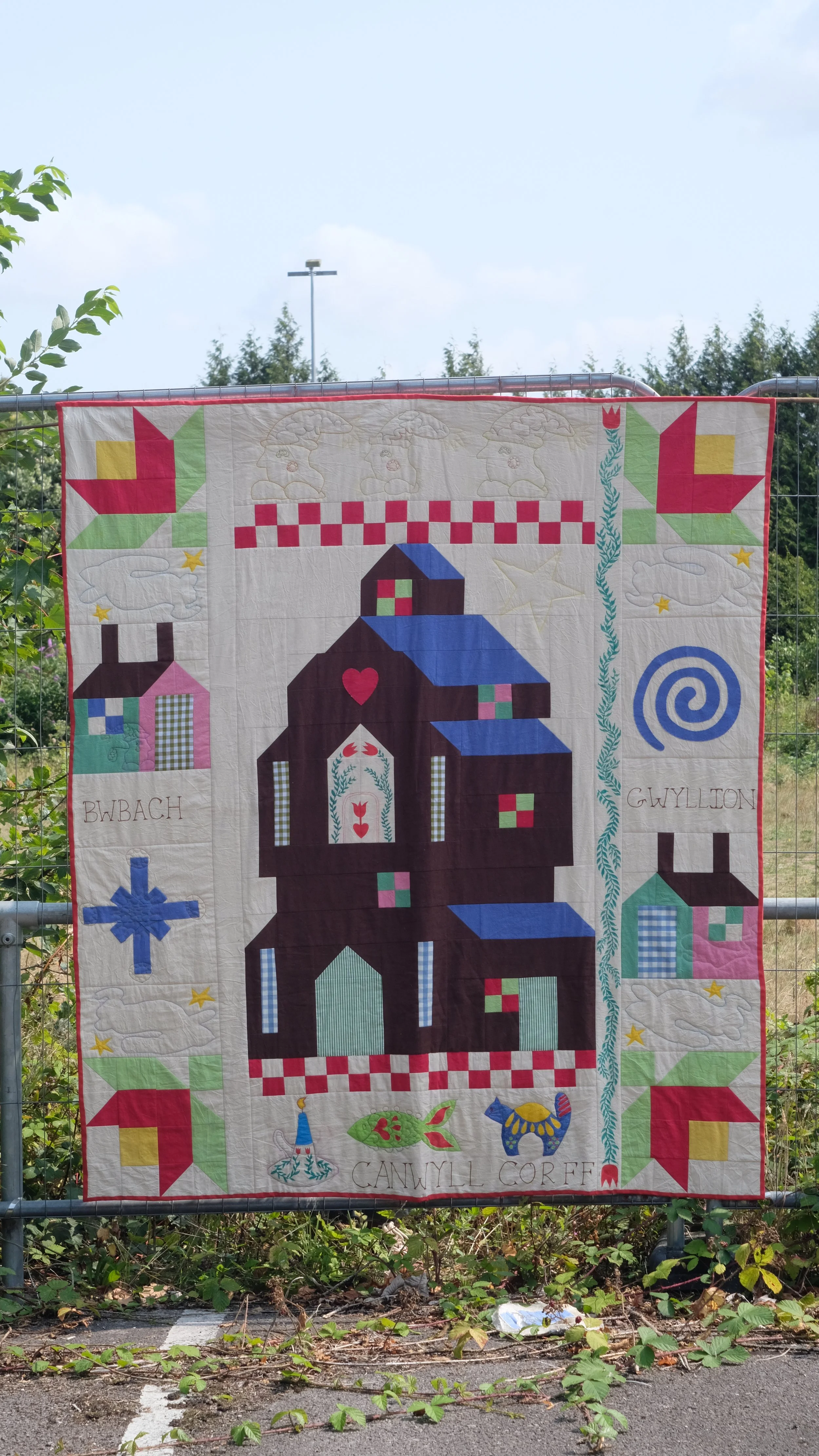 Hunk Williams is a Welsh textile artist whose work embraces playfulness, imperfection and individuality. For the Craft Trail he has created a large patchwork quilt that gathers together fragments of story, stitching motifs from Clive Hicks-Jenkins’ Hansel and Gretel alongside words from Welsh folklore. The gingerbread house and tulips of Clive’s tale appear with names such as Bwbach, a household goblin; Gwyllion, mountain spirits or hags; and Canwyll Corff, the corpse candles said to flicker along old paths to the grave.